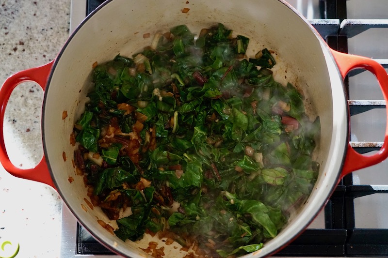 - Return the Dutch oven to the stove. Lower the heat to medium and add 1 tablespoon of olive oil to the pan. Put in the chopped onions and sprinkle them with 1/4 teaspoon of salt. Cook for about 5 minutes, stirring frequently, then add the chard stems. Cook another 5 minutes, stirring frequently and scraping up any browned bits from the bottom of the pan. (I added a tablespoon or two of water when the onions and chard stems started sticking.)