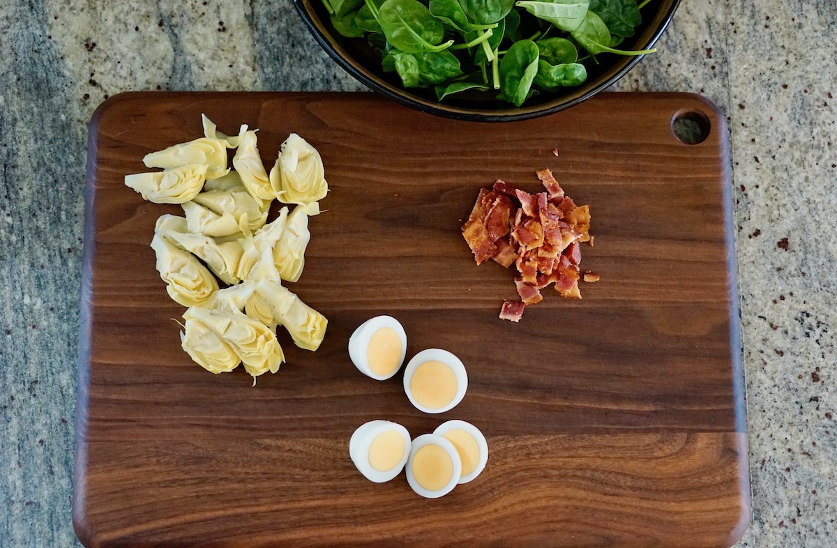 Spinach Salad Sevillaña is a pretty dish that highlights Spanish flavors. Baby spinach leaves are easy to access year-round and create a verdant yet mild canvas for artichoke hearts, boiled eggs, and crisp bacon. With Easter around the corner, we have lots of boiled eggs on hand. And frying up the bacon takes less than 10 minutes.