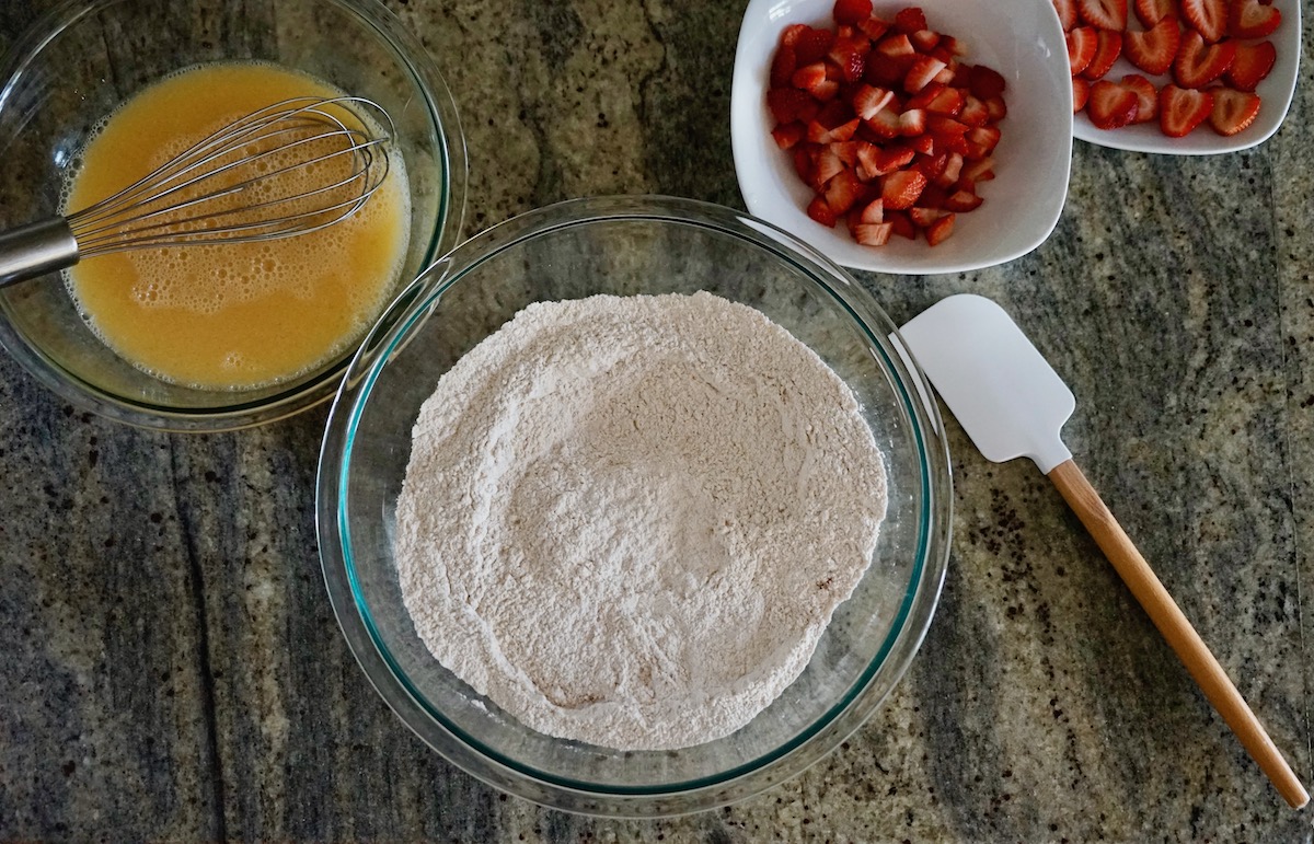 - In a large bowl, whisk together the flours, sugar, baking powder, cinnamon, and salt to combine thoroughly.
