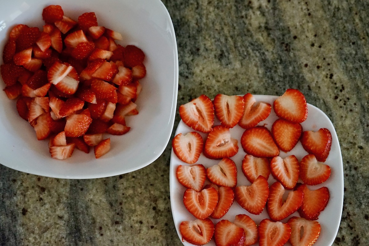 - Slice the strawberries about 1/16 inch thick. Put aside 18-24 middle slices (that look like hearts). Chop the remaining strawberries into 1/2-inch pieces until you have about 1 1/2 cups worth.
