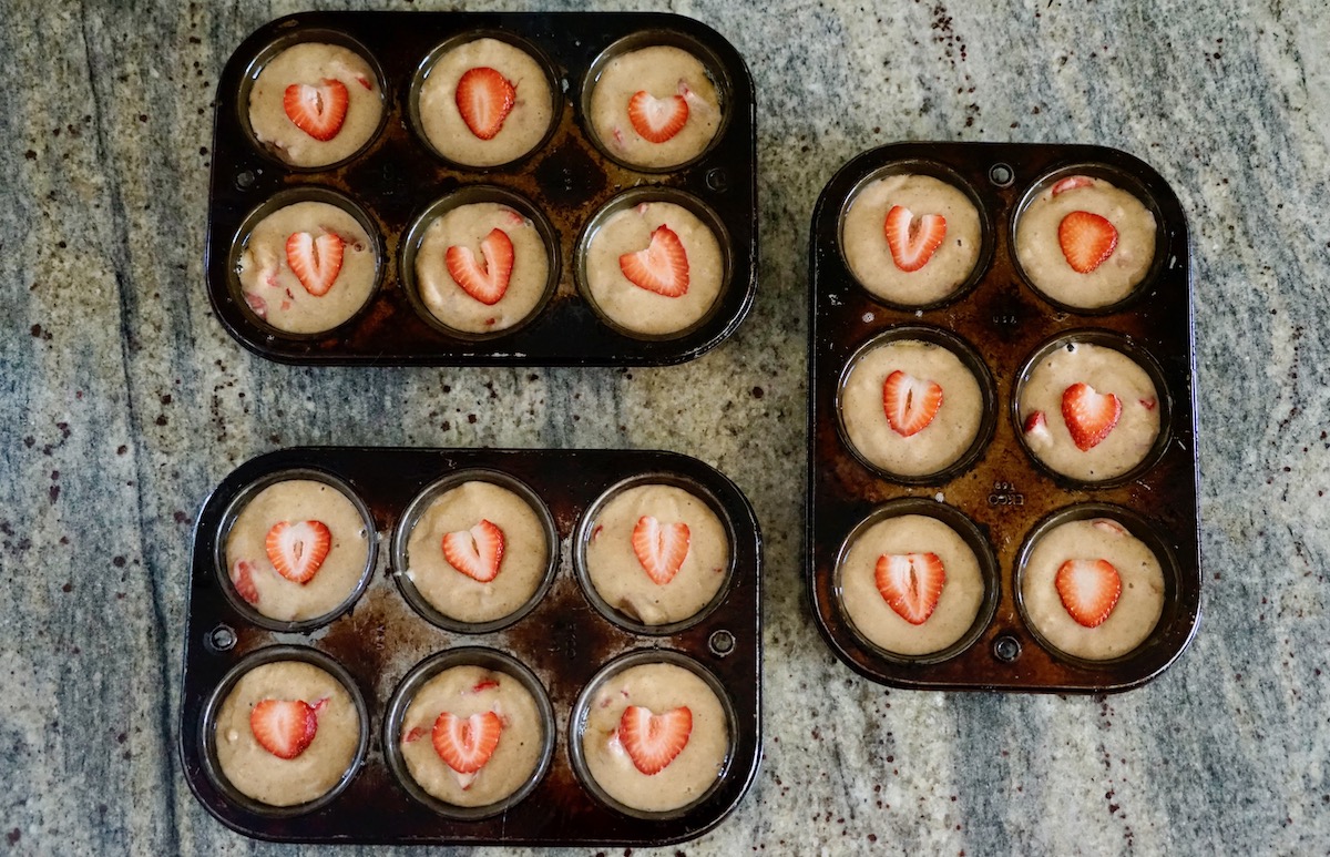 Looking at these baked beauties, there is no doubt that strawberries are a star, as each muffin is topped with a fresh strawberry slice. More chopped strawberries flavor the batter and give the muffins a springtime perfume of fresh fruit. Berries that are on the smaller side work best with this recipe, so that each muffin has a heart-shaped slice of fruit centered right on top.