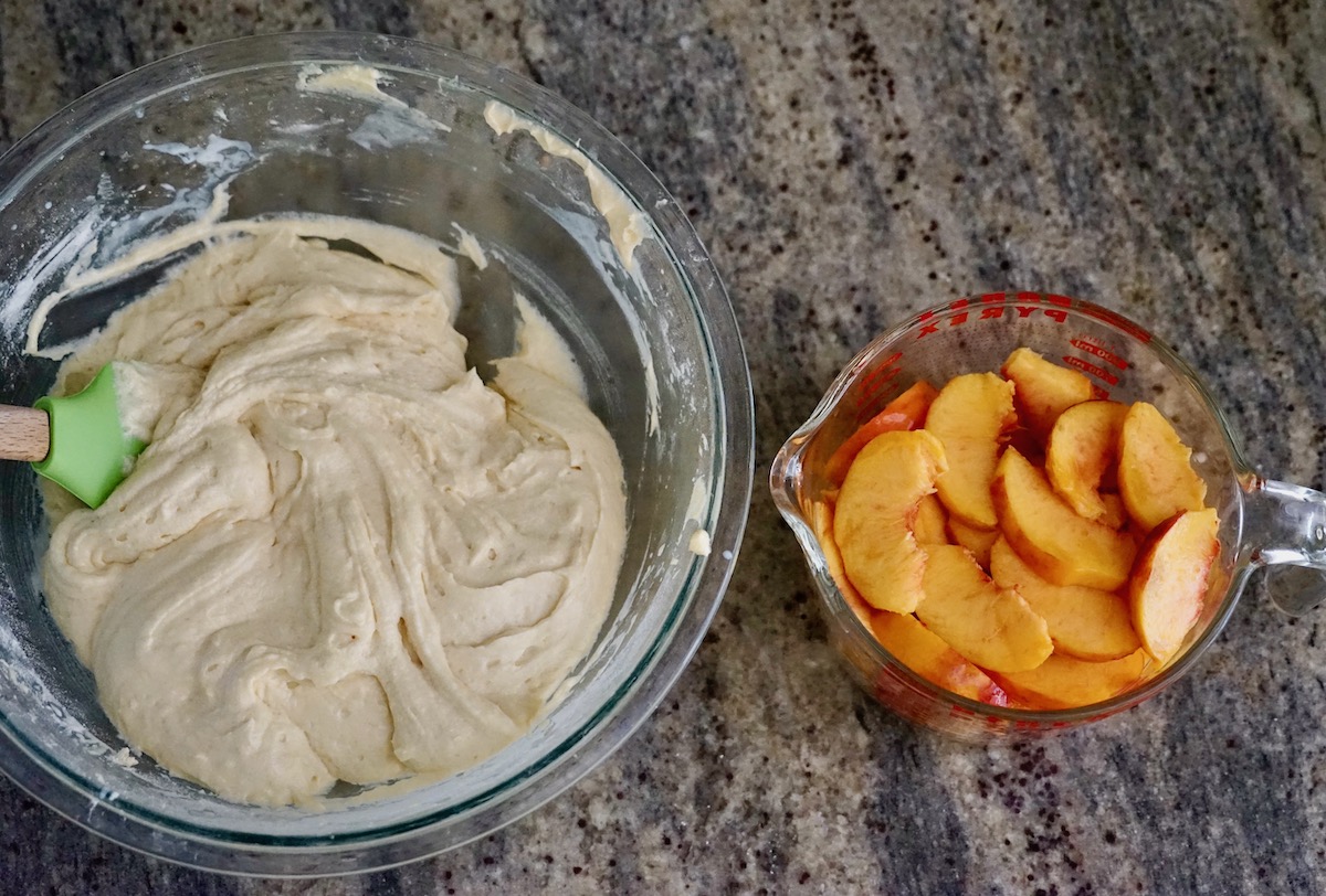 - To peel the peaches, bring a medium saucepan of water to a boil. Make sure the water is deep enough to totally submerge a peach. Cut a small X in the bottom of every peach (about ½-inch long). Lower each peach into the boiling water for 15-30 seconds, then lift out and drain. Transfer to bowl. Remove the peach skin and slice thinly when ready to top the batter.