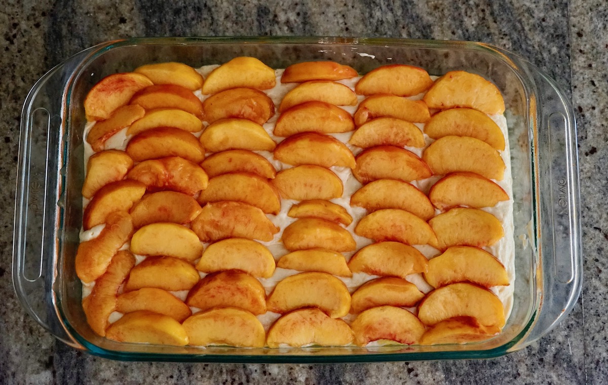 - Pour batter into the prepared baking dish, spreading it evenly. Place the peach slices atop the batter in close rows, overlapping them if necessary. Coat the dull side of a piece of aluminum foil larger than the baking pan with the nonstick spray. Cover the baking dish with the foil, sprayed side down. Seal tightly around the edges of the baking pan.