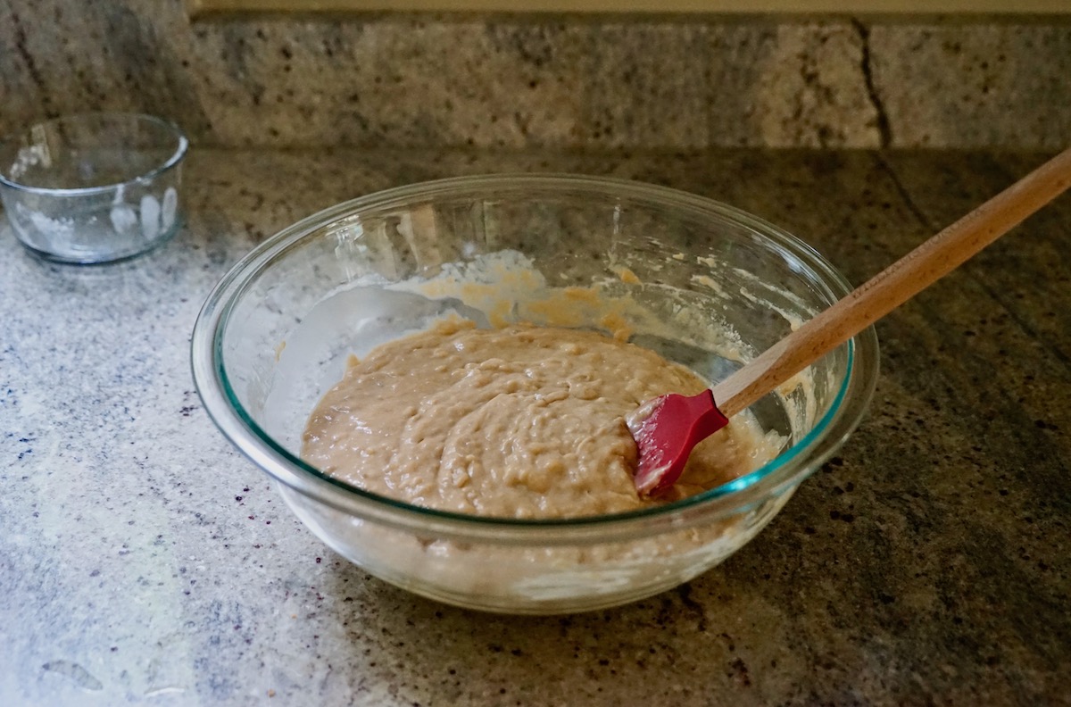 - In a large bowl, whisk the melted butter, brown sugar, and vanilla extract together until thoroughly mixed. Add the beaten eggs and whisk to incorporate them. Add the buttermilk and the mashed bananas and mix well. Sprinkle the baking soda over the mixture and whisk to mix it in. Sprinkle the salt in and whisk well. Fold the flour in gently, using a flexible spatula, mixing only until you don’t see any evidence of flour in the batter. Do not overmix the batter.