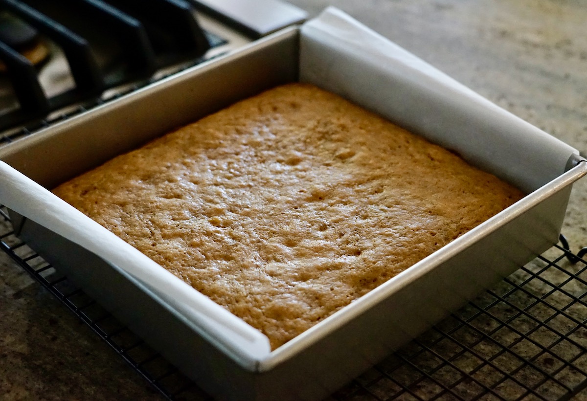 - Transfer the batter to the prepared cake pan. Smooth the top of the batter and make sure it is evenly into all four corners. Bake from 25 to 30 minutes, rotating the pan halfway through the baking time. Test the cake with a wooden skewer or toothpick for doneness. Only a crumb or two should adhere to the wooden tester.