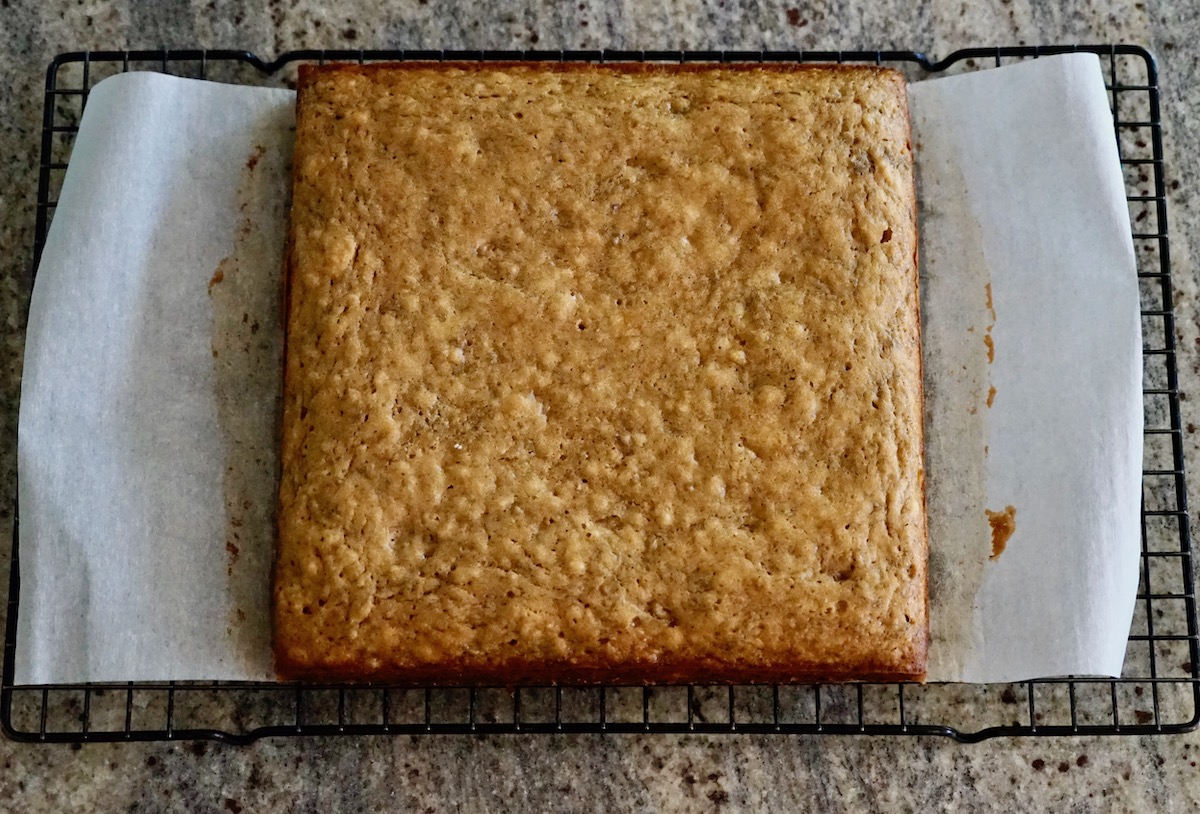 Once the cake is baked, it cools for a while in its pan, sending lovely aromas through the kitchen. Then it rests on a rack outside of the pan until it’s ready to be frosted.