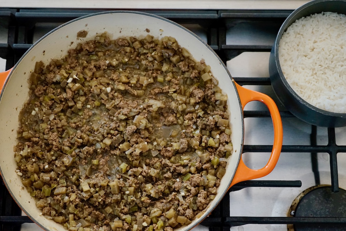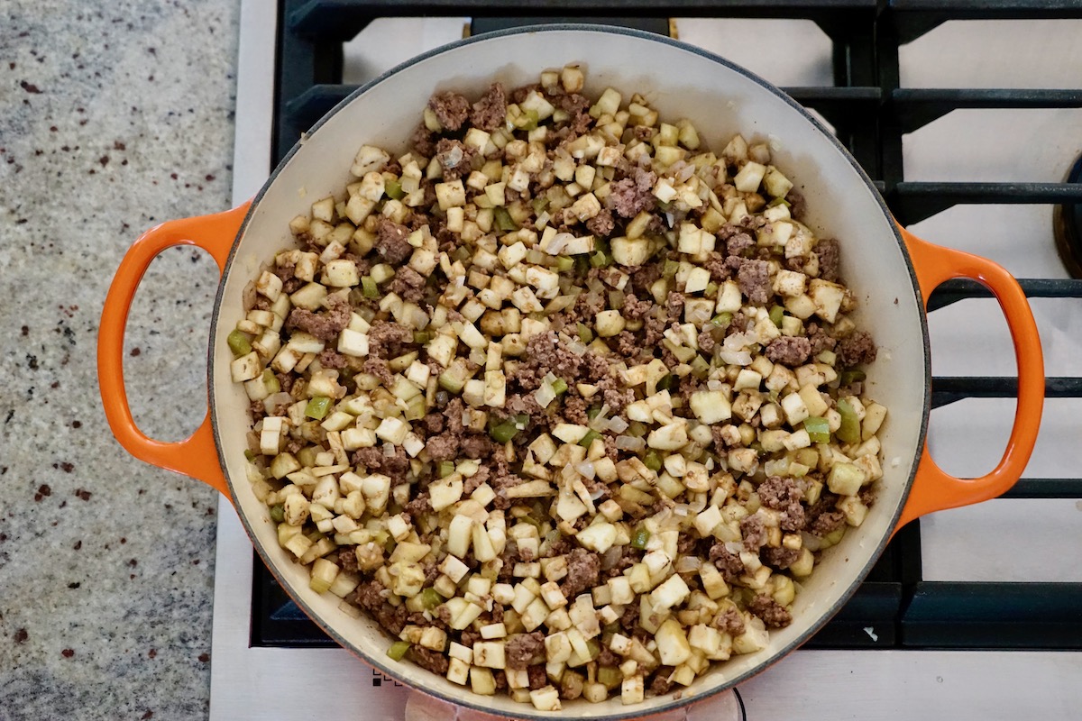 My mother browned her ground beef first, then added the trinity and cooked it until the vegetables were wilted. I start my eggplant dressing by cooking the trinity first, in order to get the onions, celery, and bell pepper as soft as possible. Next, I add the ground beef, taking care to break it up into small pieces that can brown well. Last, I put the pile of finely chopped eggplant in the skillet with a bit of water and Cajun seasoning.