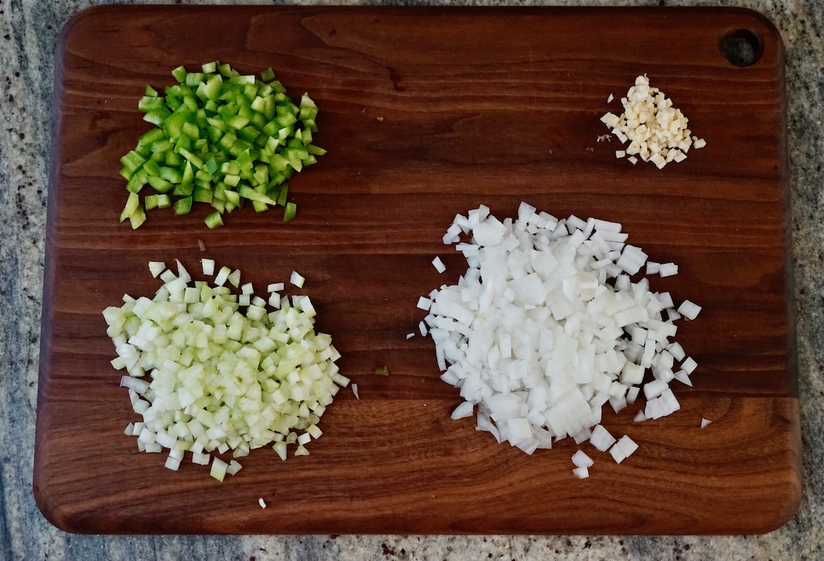 My mom’s recipe uses globe (sometimes called American) eggplants or Italian eggplants. One large or two small eggplants work well in this dish. To season the dressing, she used the Cajun trinity—chopped onion, celery, and bell pepper—plus some garlic and Cajun seasoning.