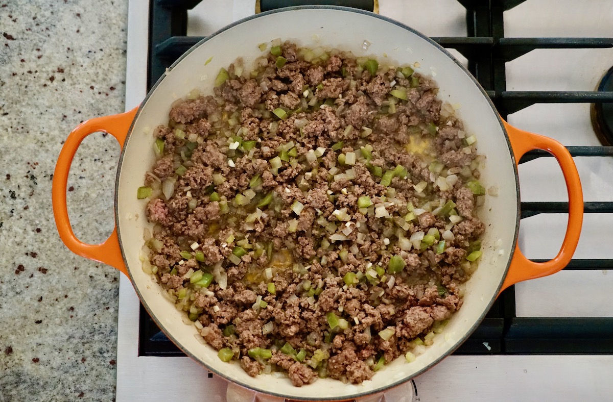 My mother browned her ground beef first, then added the trinity and cooked it until the vegetables were wilted. I start my eggplant dressing by cooking the trinity first, in order to get the onions, celery, and bell pepper as soft as possible. Next, I add the ground beef, taking care to break it up into small pieces that can brown well. Last, I put the pile of finely chopped eggplant in the skillet with a bit of water and Cajun seasoning.