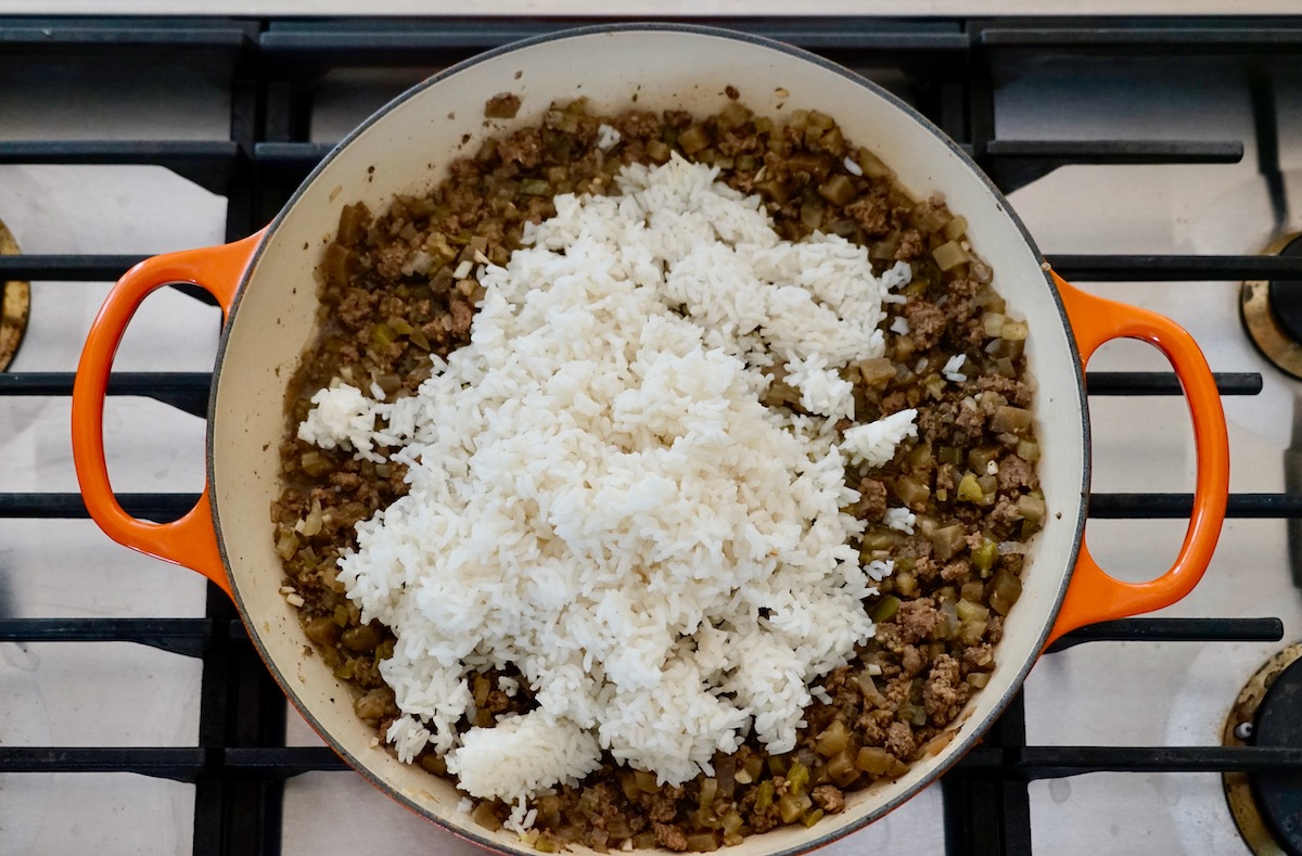 Ground beef gives the dressing heft, while rice acts as a binder.