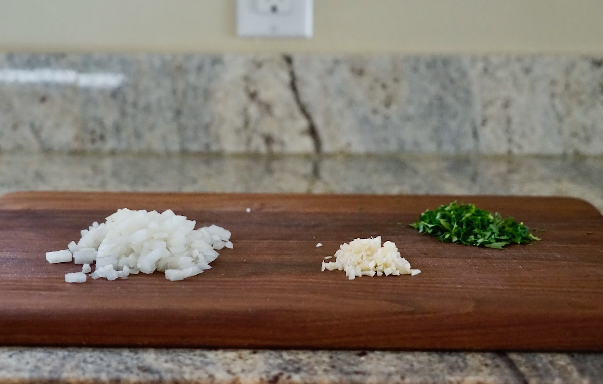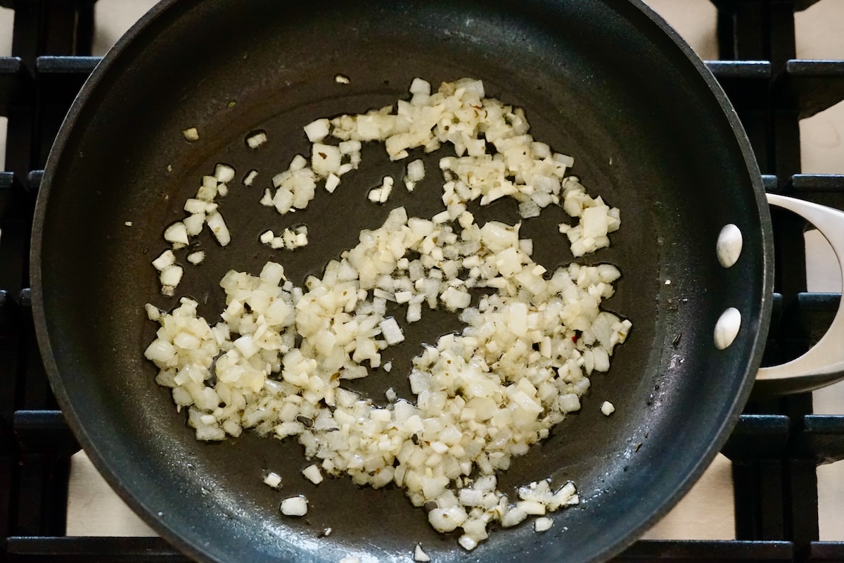 I’ve adapted the recipe over time, switching out panko crumbs and additional dried herbs for the seasoned breadcrumbs in the original. I doubled the garlic I also made a slight tweak to the cooking method. I sauté the chopped onion to a soft stage before adding the minced garlic to the skillet.