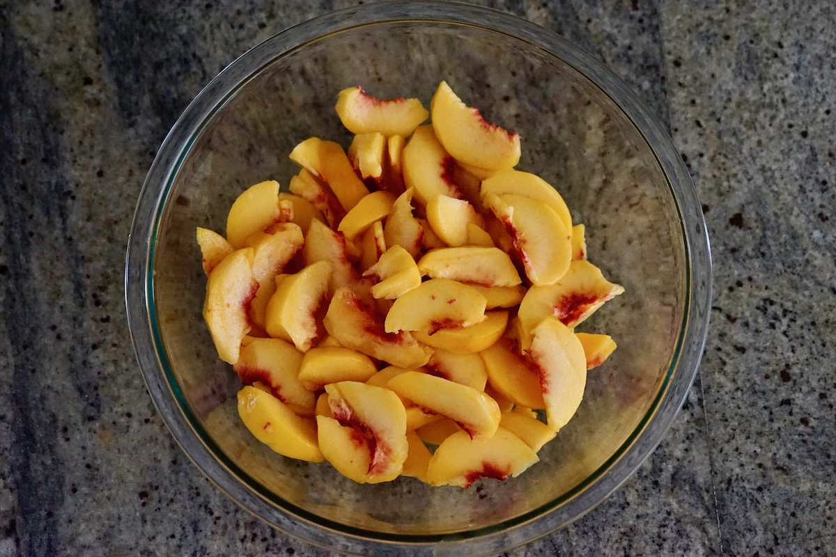 - Squeeze the lemon juice into the bottom of a large bowl. Cut each peach into 1/2-inch slices, dropping the slices directly into the lemon juice. After every 2 or 3 peaches, toss the slices in the juice to help prevent discoloring. Discard the stones.