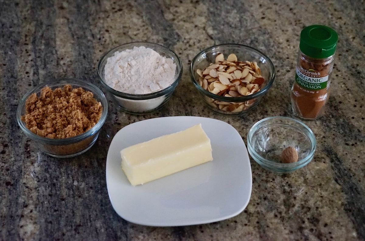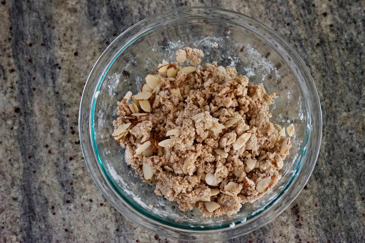 - Combine the flour, brown sugar, salt, cinnamon, and nutmeg in a medium size bowl until mixed well. Cut the butter into 6 or more portions and add to the flour mixture. Use two knives or your fingers to incorporate the butter into the flour mixture. It should end up like crumbly sand with a few lumps. Add the sliced almonds and mix until combined thoroughly. Set aside.