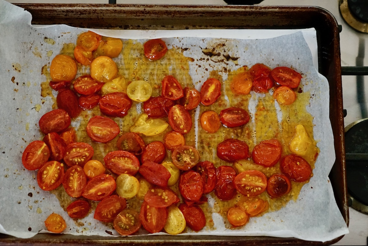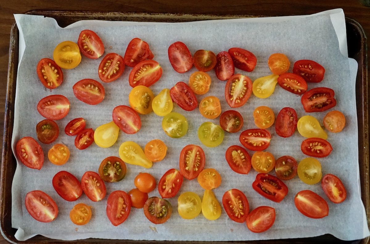 - Arrange the cherry tomato halves on the lined sheet pan and drizzle with 1 tablespoon of olive oil. Toss the tomatoes so that the oil is distributed among them evenly. Season to taste with salt and freshly ground black pepper. Spread the tomatoes out on the sheet pan so that they’re not overlapping each other. Bake for 20 minutes, stirring the tomatoes halfway through the cooking time.