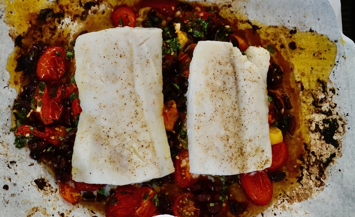 Raw cherry tomato halves bake with olive oil, salt, and black pepper for a while. They collapse and caramelize and grow in flavor. Then minced garlic and red pepper flakes go into the tomatoes and bake briefly, lending a punch of seasoning. Last, parsley and kalamata olives join the tomato mixture, and the fish bakes on top of it all.