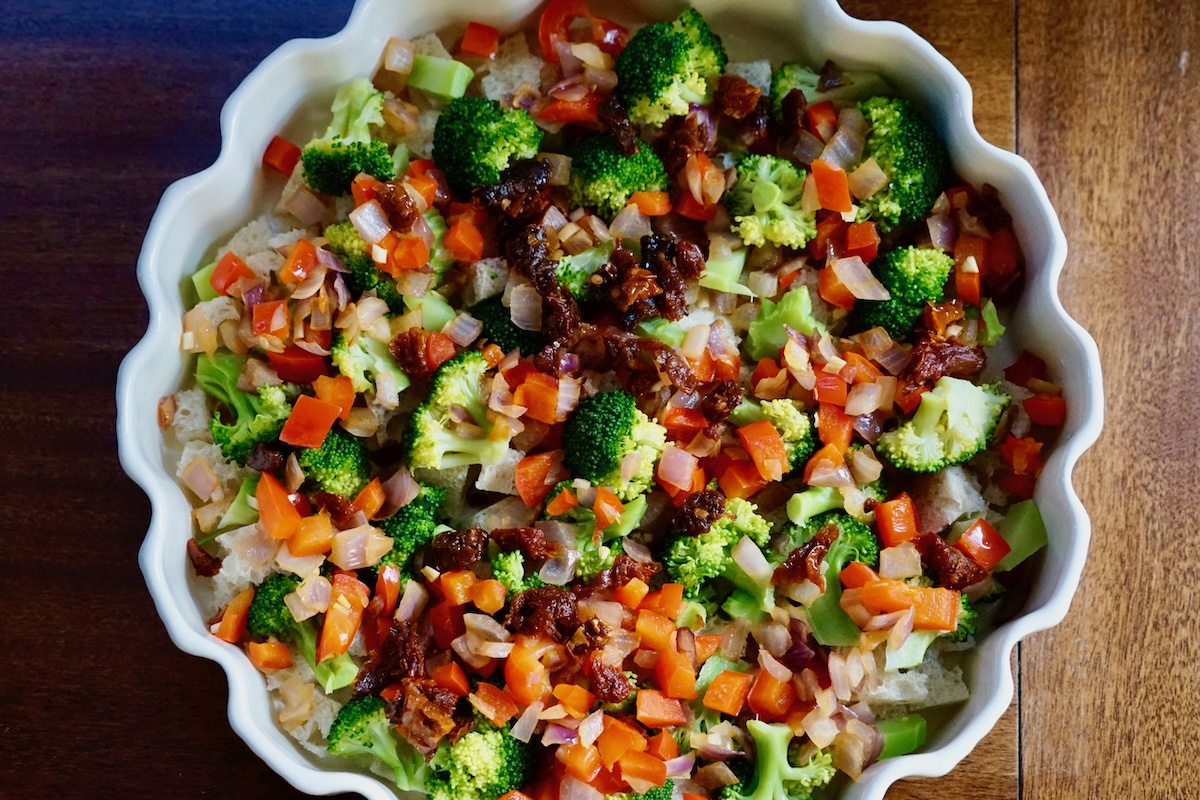 The night before you dazzle your breakfast guests, you can assemble the strata, layering cubed bread, small steamed broccoli florets, cooked onions, bell pepper, and garlic, sun-dried tomatoes, and thyme leaves.