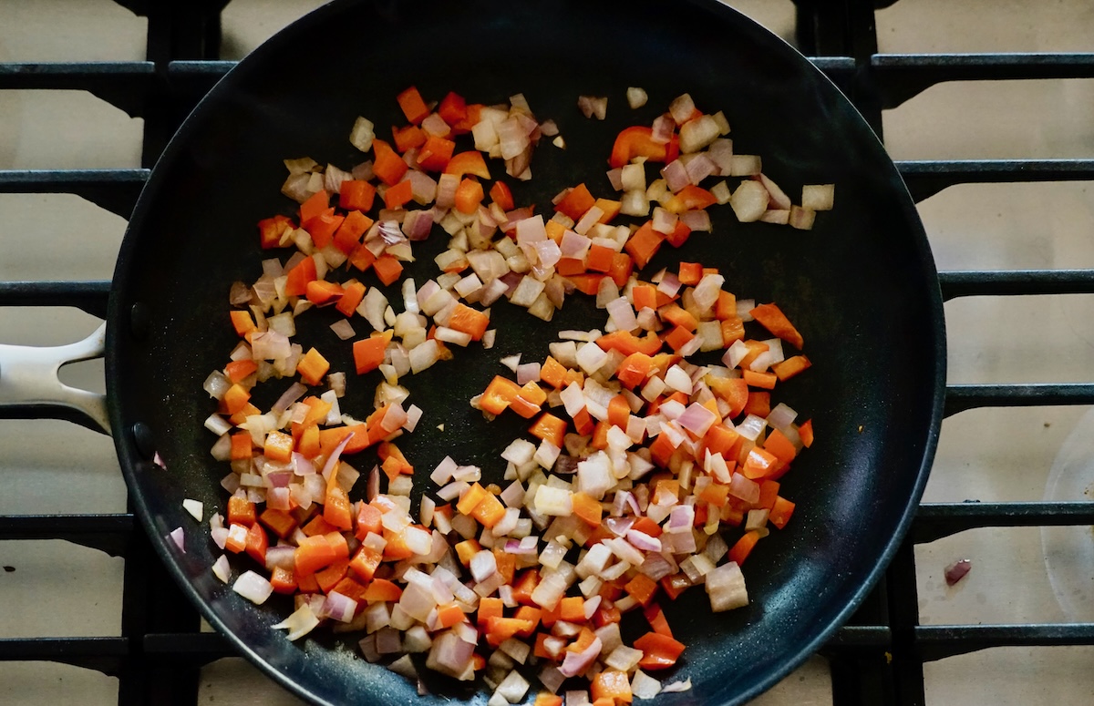 - Heat the olive oil in a large nonstick skillet and sauté the onion and bell pepper over medium high heat for about 6 minutes, stirring occasionally, until soft and onion is starting to turn golden. Add garlic and cook one more minute. Transfer onion mixture to bowl and allow to cool off.